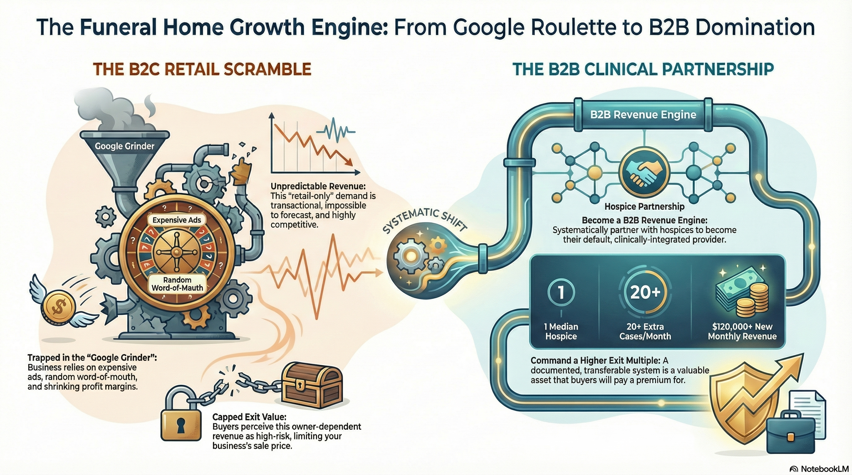 Instead of “hoping” hospices keep recommending you, you build structured partnerships and education that make your firm the safest, most clinically aligned option in their eyes—which means more first calls, more at-need and pre-need opportunities, and less pressure to discount.